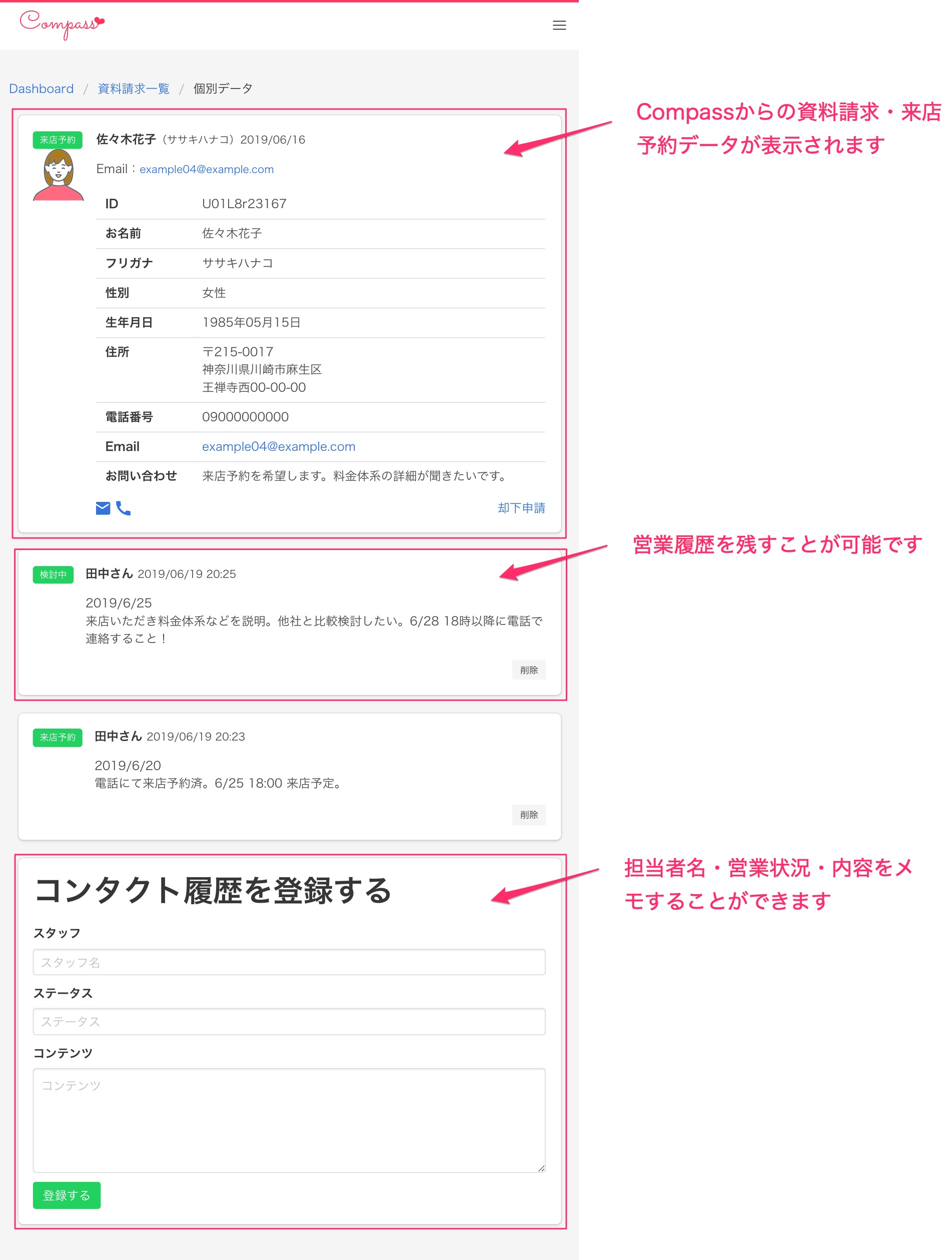 Compassを通じて資料請求・来店予約したデータは、管理画面から確認する事ができます。もちろん、スマホにも対応していますので、どこでもデータの確認、営業履歴の確認が可能です。