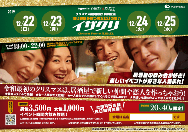婚活パーティーを全国で開催するPARTY☆PARTYと、個室居酒屋のアンドモアがコラボレーション。2019年12月24日(火)と25日(水)の二日間、全国45箇所で婚活パーティー「イザクリ☆」を同時開催します。 -